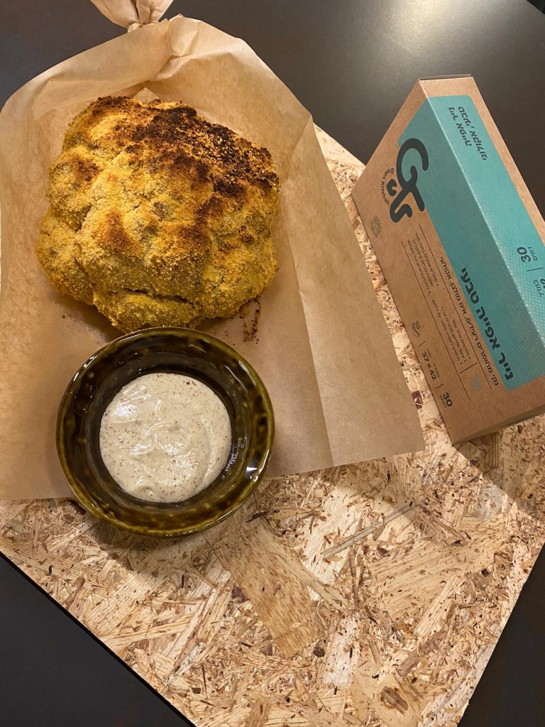 מניחים את הכרובית החלוטה, מורחים את רוטב הקשיו על כל הכרובית, ומפזרים מעל פירורי לחם.